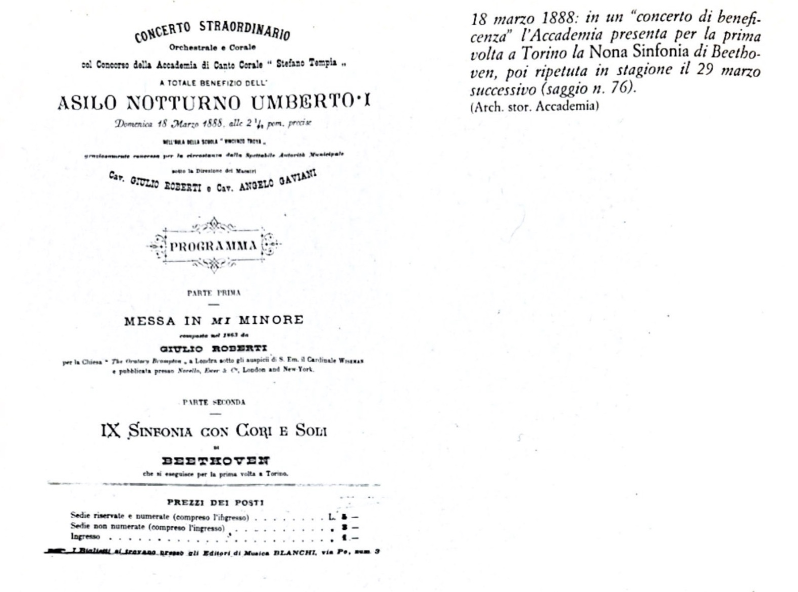 The first performance/concert was held on 12 March 1876, under the direction of Tempia himself, in the hall of the Gioberti Ginnasio in Turin.